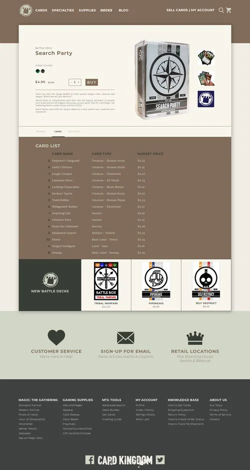 Card Kingdom has been selling Magic: The Gathering cards and supplies since 1999. They're known for their lightning-fast domestic and international shipping, exceptional customer service, and passionate support of the Magic community and those who create content for it. They also own and operate two game store/cafes in the Seattle area called Mox Boarding House, which offer in-store pick-up for local Card Kingdom customers.
